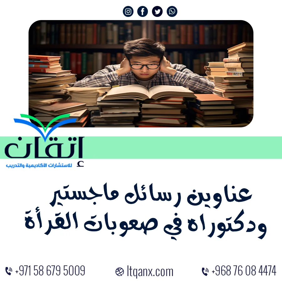 وفي الختام تظل صعوبات القراءة من الموضوعات الحيوية التي تستحق المزيد من البحث والدراسة، لما لها من أثر مباشر على نجاح الطالب وتقدمه الأكاديمي، وإذا كنت تبحث عن عناوين رسائل ماجستير ودكتوراه في صعوبات القراءة تتسم بالابتكار والدقة، فإن شركة إتقان للاستشارات الأكاديمية والتدريب تضع بين يديك خبراتها لمساعدتك في إعداد بحوث جامعية قوية وصياغة عناوين مناسبة تلبي معايير جامعتك، ومع دعمنا المتكامل تضمن لنفسك التميز والنجاح في مسيرتك العلمية، ويمكنك التواصل معنا عبر الواتساب للحصول على المزيد من المساعدة والإرشاد.