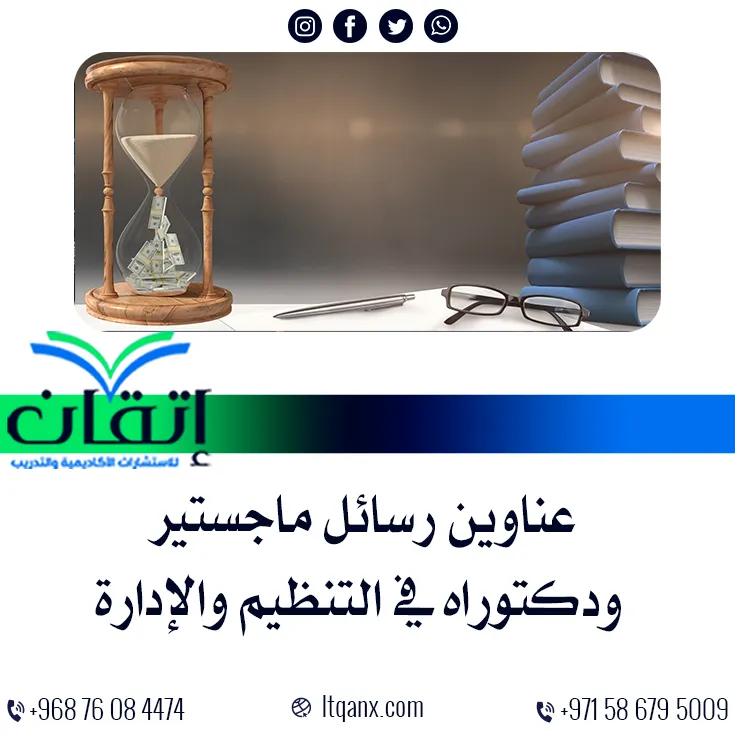 وفي الختام، إن التنظيم والإدارة ليسا مجرد أدوات إدارية بل هما ركيزة أساسية لصياغة مستقبل أكثر استقرارًا ونجاحًا للمؤسسات والأفراد على حد سواء، ولأن قوة البحث تكمن في بدايته، فإن حسن اختيار عناوين رسائل ماجستير ودكتوراه في التنظيم والإدارة يمثل خطوة حاسمة نحو بناء دراسات رصينة تواكب المتغيرات وتدعم التميز المؤسسي، ومن هذا المنطلق تضع شركة إتقان للاستشارات الأكاديمية والتدريب خبرتها بين يديك عبر فريق متخصص يقدم الدعم الكامل في صياغة العناوين وكتابة الأبحاث وفق أعلى المعايير الأكاديمية، ومع إتقان يمكنك دخول بوابة التميز الأكاديمية لتبدأ رحلة علمية ثرية تجمع بين الجودة والإبداع، وكل ما عليك فقط هو التواصل معنا عبر الواتساب بسهولة، ودعنا نصنع معك قصة نجاح أكاديمية فريدة.