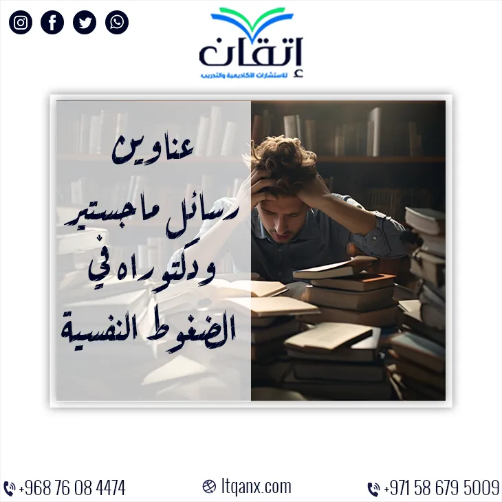 الضغوط النفسية لم تعد مجرد ظاهرة فردية بل تحوّلت إلى قضية عالمية تمس كل تفاصيل حياتنا من الأداء الأكاديمي إلى جودة العلاقات، ومن هنا يكتسب البحث في هذا المجال أهميته القصوى، وخصوصًا عبر عناوين رسائل ماجستير ودكتوراه في الضغوط النفسية التي تعكس أفقًا علميًا واسعًا وفرصًا لا محدودة للإبداع، ونحن في شركة إتقان للاستشارات الأكاديمية والتدريب ندرك قيمة هذا التخصص ونمنحكم باقة حديثة ومميزة من العناوين التي تفتح الطريق نحو دراسات معمقة وحلول مؤثرة، تخيل أن تكون أبحاثك جسرًا بين النظرية والتطبيق، وأن تصنع أثرًا يغير حياة الأفراد والمجتمعات. ومع إتقان أنت لا تكتب بحثًا فحسب بل تضع بصمة أكاديمية خالدة.