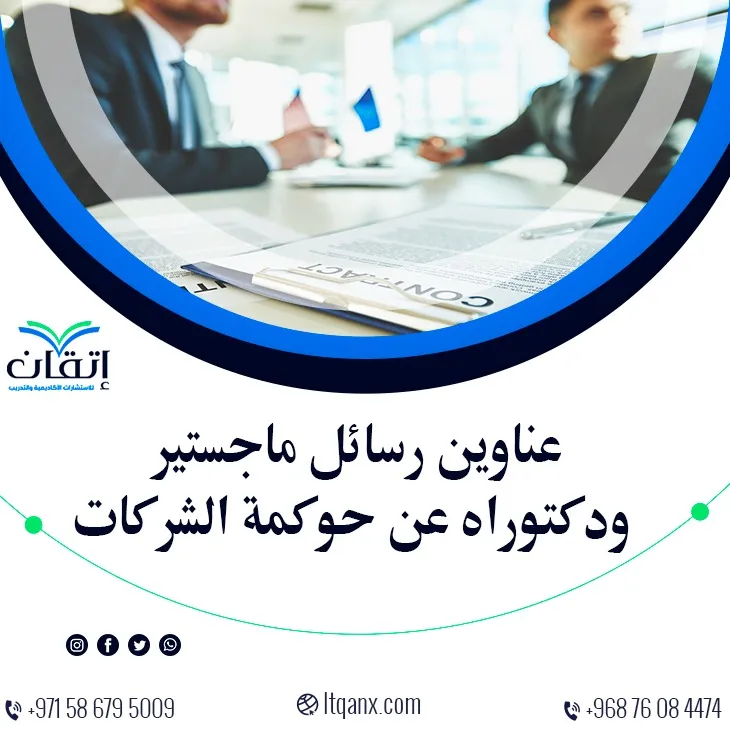 وفي الختام يتضح لنا أن موضوع حوكمة الشركات يمثل دورًا مهمًا للبحث والدراسة في ظل التحديات الاقتصادية والتنظيمية التي تواجه المؤسسات؛ لذا اهتم الباحثين لاختيار موضوعات مبتكرة تعالج الجوانب القانونية والإدارية والمالية لهذا المجال، وقد اهتمت شركة إتقان للاستشارات الأكاديمية والتدريب بتقديم عناوين رسائل ماجستير ودكتوراه حديثة 2025 – 2026 عن حوكمة الشركات لتساعدك على اختيارك لبحثك العلمي، ويمكننا مساعدتك في إعداد رسائلك العلمية بشكل احترافي عن طريق نخبة من الأساتذة، كل ما عليك هو التواصل معنا عبر الواتساب، وسيتم التواصل معكم في أسرع وقت.