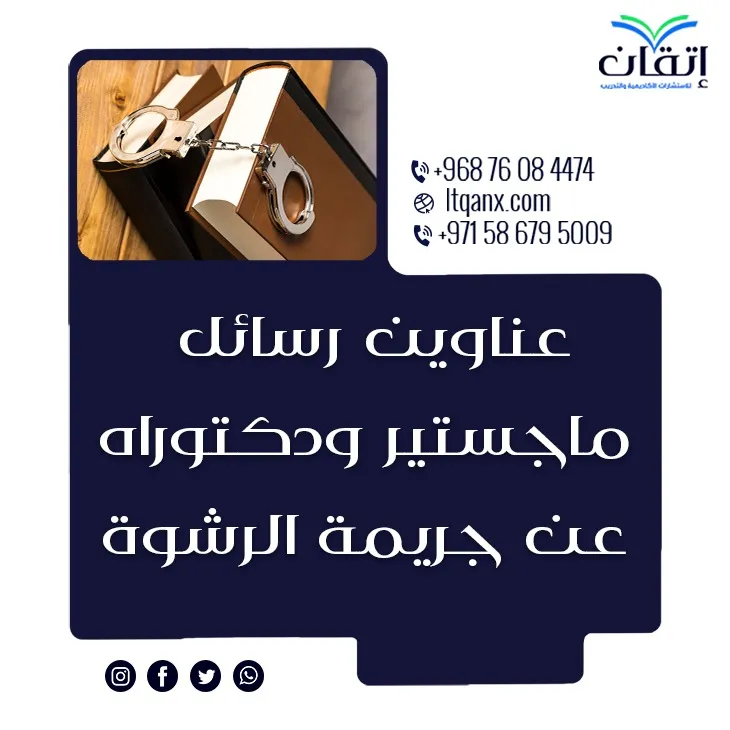 وفي الختام يتضح أن جريمة الرشوة تحظى بالكثير من الاهتمام من قِبل الباحثين؛ وذلك لتأثيرها المباشر على نزاهة الوظيفة العامة وعدم فاعلية الأجهزة الرقابية، وقد قدمت لكم شركة إتقان للاستشارات الأكاديمية والتدريب حصريًا أهم عناوين رسائل ماجستير ودكتوراه عن جريمة الرشوة، كما تقدم خدماتها في كتابة الرسائل العلمية باحترافية عالية عن طريق نخبة من الأساتذة المتخصصين، كل ما عليك هو التواصل معنا عبر الواتساب، وسيتم الرد عليكم في أسرع وقت.