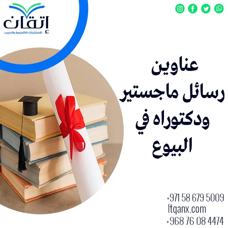 وفي النهاية بعد عرض أحدث عناوين رسائل ماجستير ودكتوراه في البيوع، نسأل الله العلى العظيم بالتوفيق لجميع الباحثين، وإذا أردت في أي وقت معرفة عناوين لرسالتك العلمية، كل ما عليك هو الاعتماد على شركة "إتقان" للاستشارات الأكاديمية والتدريب، يوجد لدينا نخبة من المتخصصين في هذا المجال، يمكنك التواصل معنا عبر الواتساب.