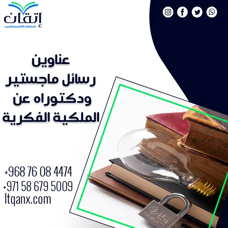 وفي الختام يتضح أن عناوين رسائل ماجستير ودكتوراه حديثة 2025 – 2026 عن الملكية الفكرية تمثل مصدرًا مهمًا للأفكار البحثية المعاصرة لمواكبة التطورات التكنولوجية والقانونية، وتقدم شركة إتقان للاستشارات الأكاديمية والتدريب خدماتها في إعداد الرسائل العلمية بشكل احترافي عن طريق نخبة من الأساتذة المتخصصين، كل ما عليك هو التواصل معنا عبر الواتساب، وسيتم الرد عليكم في أسرع وقت.