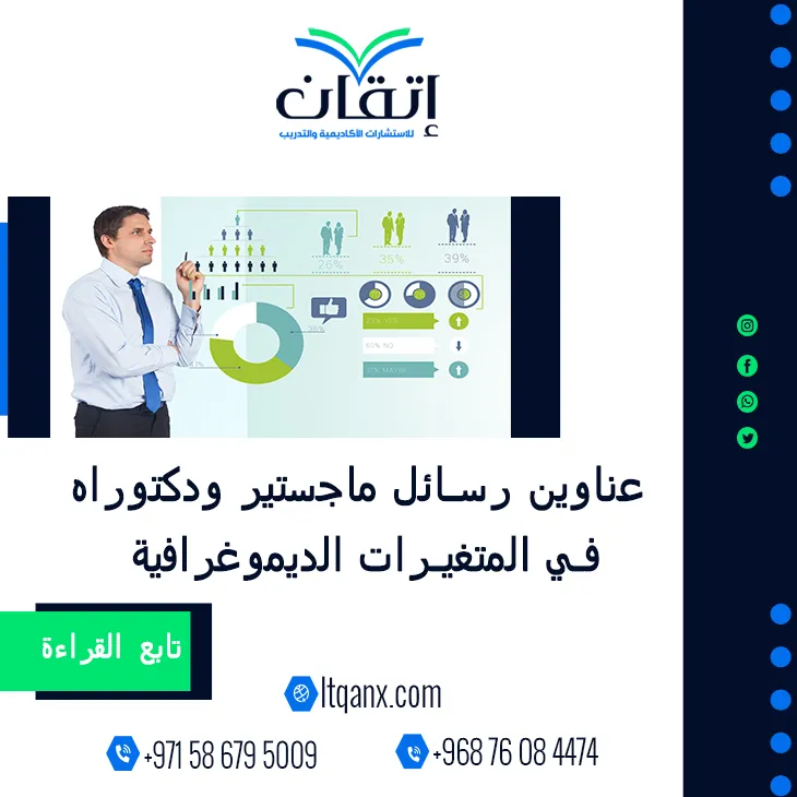 في عالمٍ تتغير فيه ملامح المجتمعات بشكل متسارع تصبح المتغيرات الديموغرافية هي البوصلة التي تكشف اتجاهات الحاضر وتستشرف ملامح المستقبل، ولهذا يتزايد اهتمام الباحثين بالبحث عن عناوين رسائل ماجستير ودكتوراه في المتغيرات الديموغرافية باعتبارها المدخل الأهم لفهم التحولات السكانية وتأثيراتها على الاقتصاد، والتعليم، وسوق العمل، وصناعة القرار، وهنا تبرز شركة إتقان للاستشارات الأكاديمية والتدريب بخبرتها الإبداعية وجودتها العالية؛ حيث يدعمها فريق متميز يدرك قيمة هذا الحقل البحثي، ويقدم باقة حصرية من أحدث وأهم العناوين المصممة خصيصًا لتمكين الباحثين وإلهامهم نحو إنتاج دراسات رصينة وفعالة.