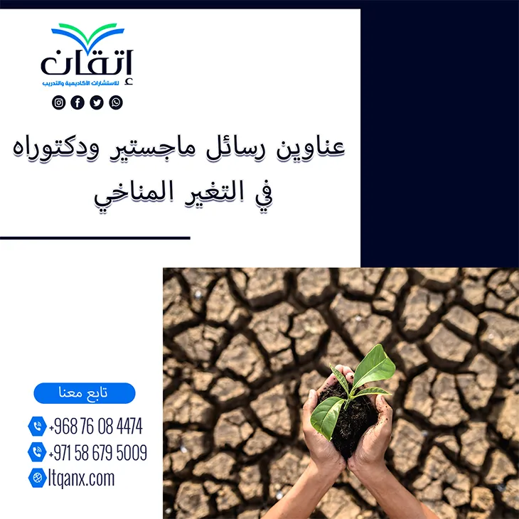 تخيل كوكبًا يتنفس ويتغير مع كل يوم جديد؛ حيث إنها تؤثر درجات الحرارة المتقلبة والظواهر الجوية غير المسبوقة على حياة البشر والطبيعة على حد سواء، وهذا الواقع يجعل التغير المناخي أكثر من مجرد موضوع دراسي، إنه مغامرة علمية تحتاج إلى بحث دقيق وفكر مبتكر، ويأتي هنا دور الباحث المبدع الذي يبحر في أحدث عناوين رسائل ماجستير ودكتوراه في التغير المناخي لاكتشاف الحلول والمستقبل المستدام، ومن منطلق إدراكها لأهمية هذه الرحلة البحثية تضع شركة إتقان للاستشارات الأكاديمية والتدريب خبرتها وإبداع فريقها المتميز بين يدي الباحثين مقدمة باقة حصرية من أهم وأحدث العناوين البحثية لدعم كل من يسعى للتفوق والتميز في هذا المجال الحيوي.
