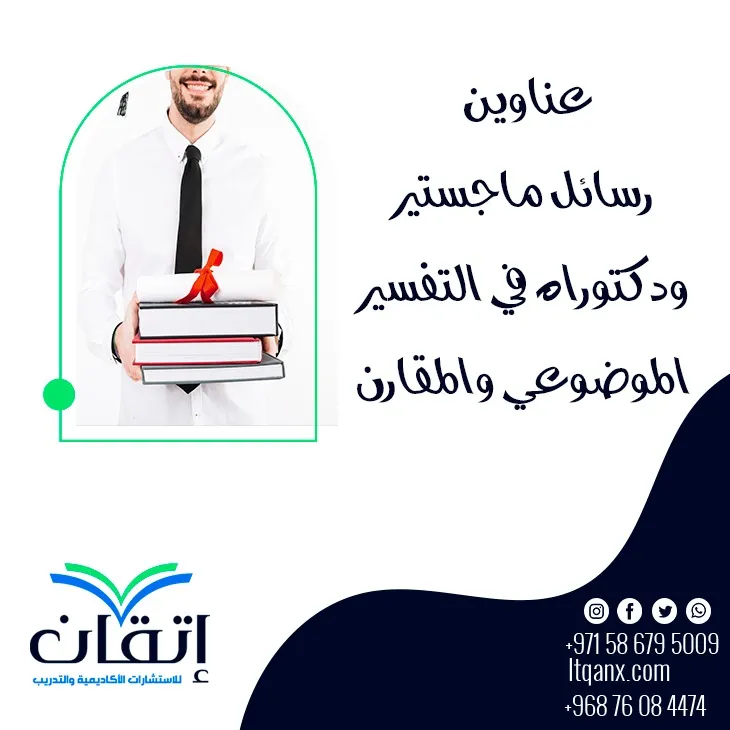 وفي النهاية بعد عرض أحدث عناوين رسائل ماجستير ودكتوراه في التفسير الموضوعي والمقارن، نسأل الله العلى العظيم بالتوفيق لجميع الباحثين، وإذا أردت في أي وقت معرفة عناوين لرسالتك العلمية، كل ما عليك هو الاعتماد على شركة "إتقان" للاستشارات الأكاديمية والتدريب، يوجد لدينا نخبة من المتخصصين في هذا المجال، يمكنك التواصل معنا عبر الواتساب.