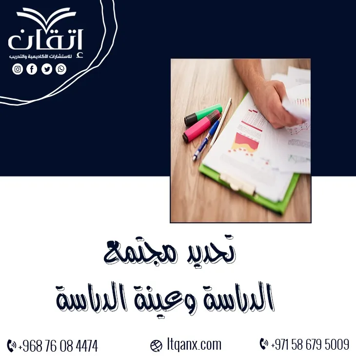 يعد تحديد مجتمع الدراسة وعينة الدراسة من الخطوات الأساسية التي تضمن نجاح أي بحث علمي؛ حيث يؤثر بشكل مباشر على دقة النتائج وقوة الاستنتاجات، اختيار العينة بعناية يساهم في تمثيل المجتمع الأصلي بشكل صحيح؛ مما يعزز مصداقية البحث؛ ولضمان تحليل إحصائي دقيق تقدم شركة إتقان للاستشارات الأكاديمية والتدريب خدمات متخصصة في التحليل الإحصائي، مع حلول مبتكرة ودعم مستمر للباحثين، لا تتردد في التواصل معنا عبر الواتساب للحصول على استشارات علمية متكاملة وتسهيل تجربتك البحثية.