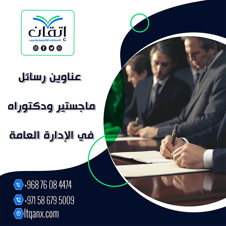 وفي ختام الحديث عن هذا المجال الإداري الحيوي نؤكد أن شركة إتقان للاستشارات الأكاديمية والتدريب هي شريككم نحو النجاح والتميز الأكاديمي، ونحن جاهزون لتقديم الدعم الشامل في جميع مراحل رحلتكم البحثية؛ لذلك لا تدع التحديات تعيق تقدمك بل استثمر في قائمة عناوين رسائل ماجستير ودكتوراه في الإدارة العامة التي نقدمها ندعوك الآن للتواصل معنا بكل سهولة عبر تطبيق الواتساب للحصول على هذه الباقة الحصرية وبدء رحلة الإتقان والتميز في تخصصك.