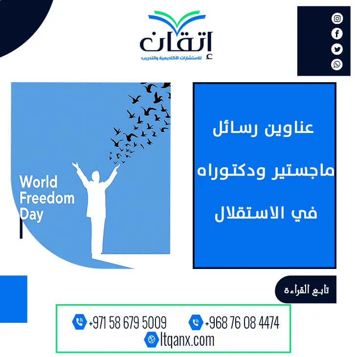 وفي ختام الحديث إذا كنت تطمح لأن تكون أحد الباحثين الذين يتركون بصمة علمية مميزة في مجال الاستقلالية، فإن شركة إتقان للاستشارات الأكاديمية والتدريب هي وجهتك الأولى نحو التميز والنجاح، وبفضل خبرتها الواسعة وفريقها المتخصص تتيح لك الشركة فرصة الوصول إلى قائمة حصرية من عناوين رسائل ماجستير ودكتوراه في الاستقلالية تم إعدادها وفق أحدث الاتجاهات البحثية؛ لكي تواكب تطلعاتك الأكاديمية؛ لذلك لا تتردد في التواصل عبر الواتساب مع فريق إتقان، ودعنا نرافقك بخطوات واثقة نحو إنجاز بحثٍ يعبّر عن فكرك، ويجسّد استقلاليتك العلمية بكل احتراف وإبداع.