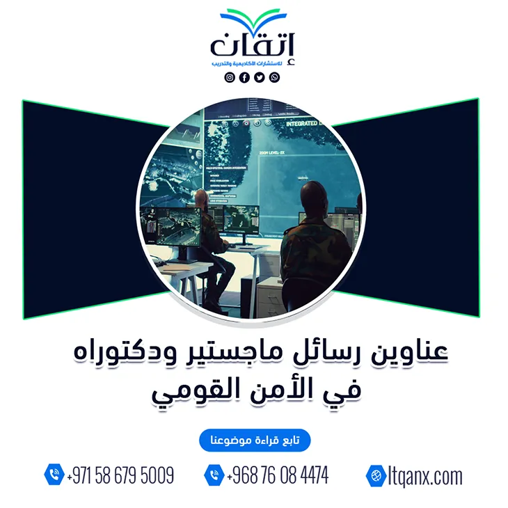 في عالمٍ تتسارع فيه التحديات وتتشابك فيه المخاطر يبرز الأمن القومي كصمام أمان لاستقرار الدول وحماية مصالحها العليا، ومع اتساع الاهتمام البحثي في هذا المجال أصبحت عناوين رسائل ماجستير ودكتوراه في الأمن القومي من أبرز المسارات العلمية التي يتوجه إليها الباحثون، وإدراكًا من شركة إتقان للاستشارات الأكاديمية والتدريب لأهمية هذا التخصص وحساسيته تميزت بجودة تنفيذها وكفاءتها الإبداعية عبر فريق محترف يمتلك خبرة بحثية راسخة؛ لذلك قامت بتوفير باقة من أحدث العناوين البحثية التي تلائم تطور الدراسات وتدعم الباحثين في مسيرتهم العلمية، واضعةً المعرفة في متناول كل من يسعى لفهم هذا المجال العميق.