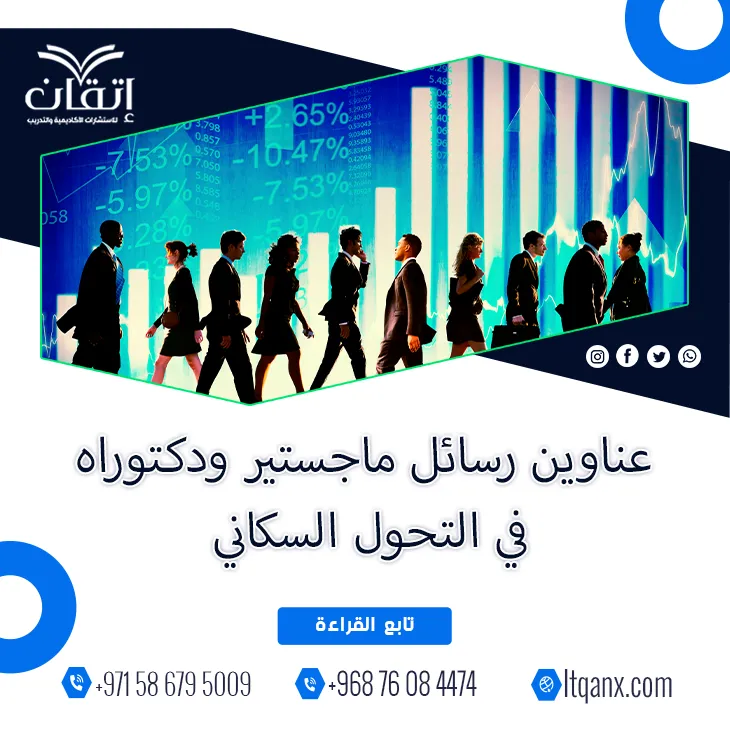 هل تدرك أن التغيرات الصامتة في التركيبة السكانية تشكل بهدوء ملامح مستقبل الدول بأكمله؟ إنها ظاهرة التحول السكاني التي تفرض تحديات اقتصادية واجتماعية عميقة؛ مما يجعلها من أهم مجالات البحث الديموغرافي، واعترافاً من شركة إتقان للاستشارات الأكاديمية والتدريب بأهمية هذا الموضوع المحوري للباحثين، وبما تتمتع به من جودة وكفاءة إبداعية بفضل فريق عملها المتميز ذي الخبرة يسرنا أن نقدم لكم باقة من أهم وأحدث عناوين رسائل ماجستير ودكتوراه في التحول السكاني؛ لكي تكون عوناً لكم في مسيرتكم الأكاديمية.
