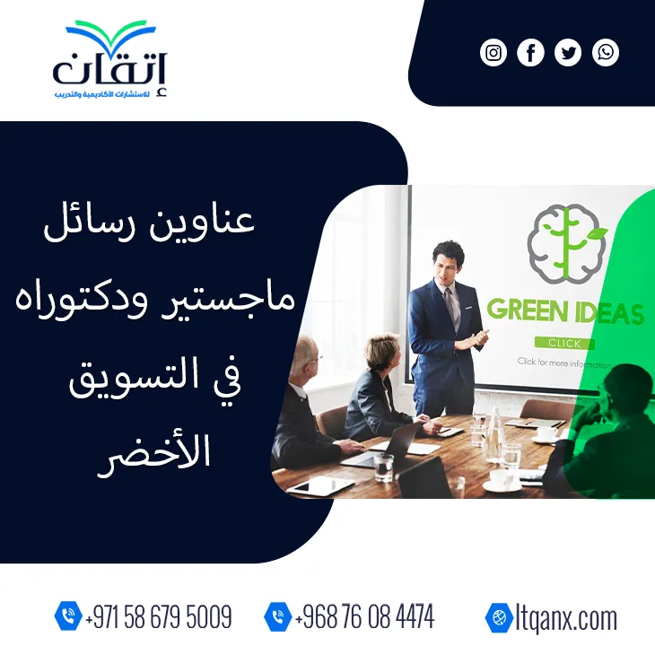 وفي ختام الحديث عن التسويق الأخضر كمسار بحثي واستراتيجي يمزج بين الابتكار والوعي البيئي يظل النجاح الأكاديمي بحاجة إلى رؤية واضحة ودعم متخصص، وهنا تتجلى مكانة شركة إتقان للاستشارات الأكاديمية والتدريب كشريك موثوق للباحثين؛ حيث إنها تمتلك الخبرة والفريق المؤهل لمرافقة كل دراسة نحو التميز والجودة، وكما توفر الشركة مجموعة من عناوين رسائل ماجستير ودكتوراه في التسويق الأخضر؛ لكي تكون مصدر إلهام ودليل عملي لكل باحث يسعى إلى التفوق، ولأن الطريق إلى المعرفة يبدأ بخطوة ندعوك للتواصل عبر الواتساب بسهولة للحصول على الدعم الأكاديمي الكامل، فإن إتقان هو المفتاح نحو التميز المستدام في البحث العلمي.