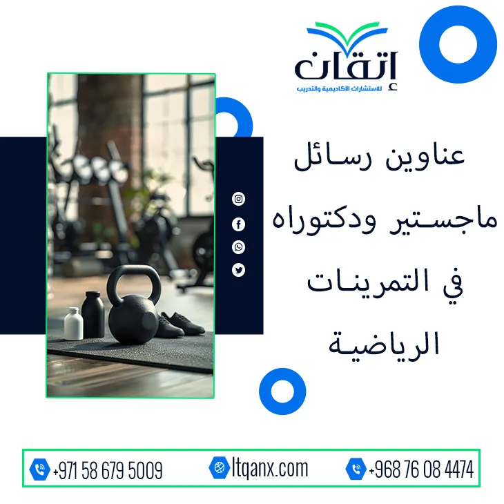 في عالم يتسارع إيقاعه وتتصاعد فيه أهمية الصحة واللياقة تأتي التمرينات الرياضية كقوة تصنع الفرق في حياة الإنسان وفي ميدان البحث العلمي، ومن هذا المنطلق تبرز شركة إتقان للاستشارات الأكاديمية والتدريب بجودتها العالية وكفاءتها الإبداعية، مقدمةً باقة من أهم وأحدث عناوين رسائل ماجستير ودكتوراه في التمرينات الرياضية؛ لكي تلهم الباحثين وتفتح أمامهم آفاق التميز الأكاديمي.
