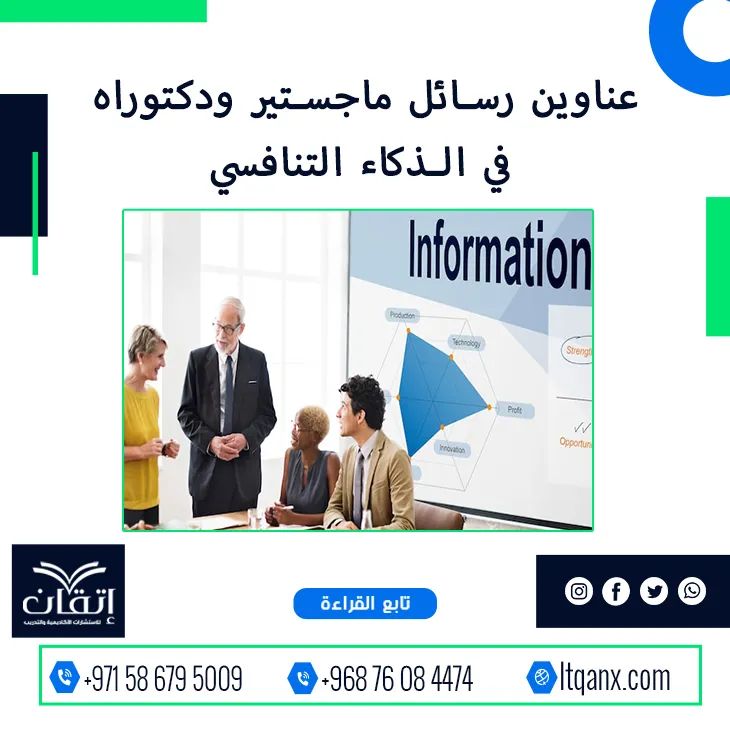 وفي ختام الحديث تؤكد شركة إتقان للاستشارات الأكاديمية والتدريب أنها ليست مجرد جهة استشارية بل شريك النجاح والتميز الأكاديمي الذي يرافق الباحث في كل خطوة من رحلته العلمية، فمن خلال ما تقدمه من عناوين رسائل ماجستير ودكتوراه في الذكاء التنافسي تفتح أمامك آفاقًا جديدة لاختيار موضوعات بحثية عصرية تخدم التوجهات الإدارية الحديثة وتثري المعرفة المؤسسية، وإذا كنت تطمح إلى التميز الحقيقي في بحثك العلمي، فلا تتردد في التواصل معنا عبر تطبيق الواتساب بكل سهولة للحصول على دعم أكاديمي احترافي يضمن لك الريادة والابتكار في مجالك.