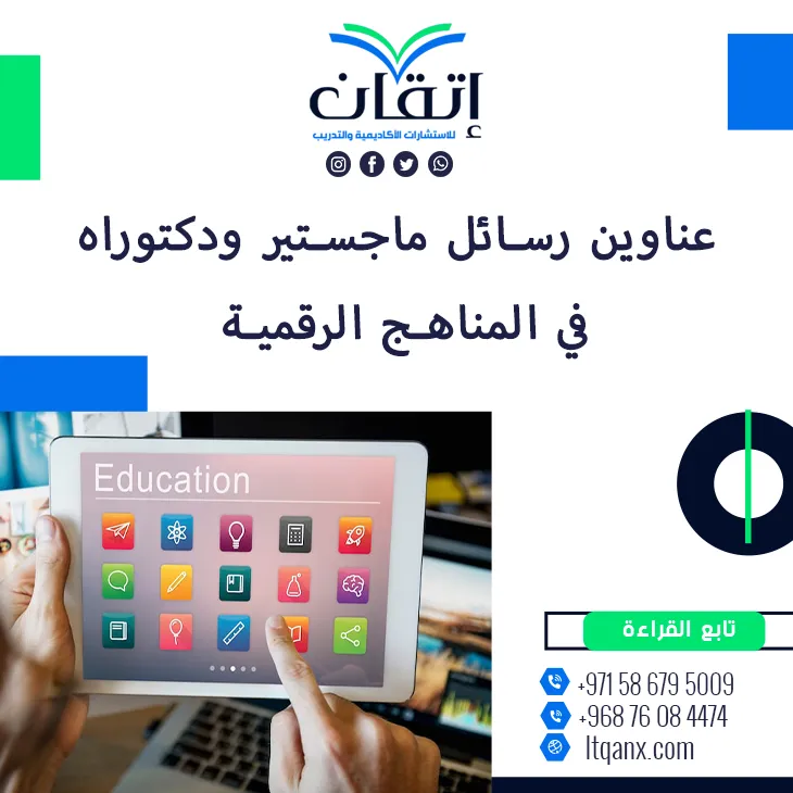 في زمنٍ أصبحت فيه الشاشة نافذة المعرفة الأولى تفرض المناهج الرقمية حضورها كأقوى أدوات التعليم وأكثرها تأثيرًا في تشكيل عقول الجيل الجديد، ومن هنا تأتي أهمية اختيار موضوعات بحثية عميقة وحديثة، وهو ما تدركه شركة إتقان للاستشارات الأكاديمية والتدريب بفضل فريقها المحترف الذي يجمع بين الجودة والإبداع، وانطلاقًا من حرصها على دعم الباحثين قامت الشركة بإعداد قائمة حصرية من عناوين رسائل ماجستير ودكتوراه في المناهج الرقمية تلائم الاتجاهات المعاصرة. فهذه العناوين ليست مجرد خيارات بل بوابات نحو بحث متجدد ورؤية أكاديمية أقوى، ومع إتقان تصبح البداية مختلفة.