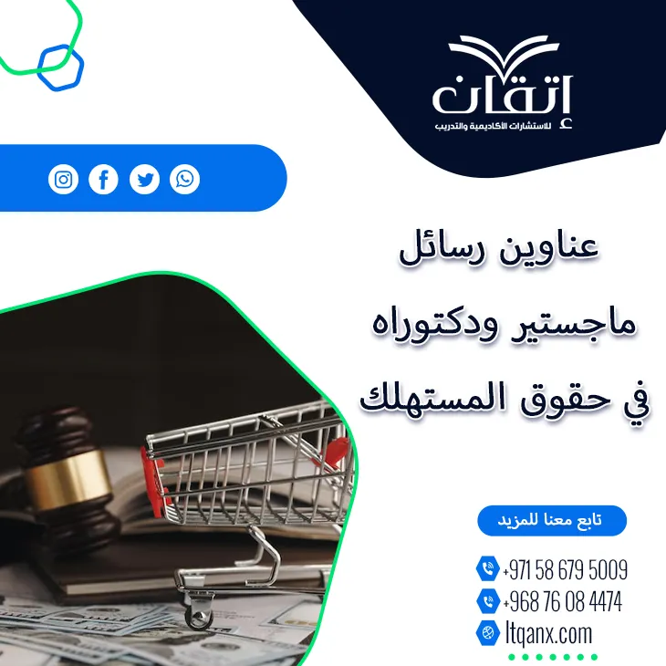 لم تعد حقوق المستهلك مجرد نصوص قانونية بل أصبحت معيارًا لعدالة الأسواق وحماية الثقة بين الأطراف، وهو ما انعكس في تنامي الاهتمام الأكاديمي وتعدد عناوين رسائل ماجستير ودكتوراه في حقوق المستهلك برؤى تحليلية معاصرة، وانطلاقًا من وعيها العميق بأهمية هذا المجال لدى الباحثين، وتتميز شركة إتقان للاستشارات الأكاديمية والتدريب بالجودة والكفاءة الإبداعية؛ وذلك اعتمادًا على فريق عمل مميز وذو خبرة؛ حيث إنها قدمت باقة نوعية من أحدث وأهم العناوين البحثية دعمًا للباحثين.