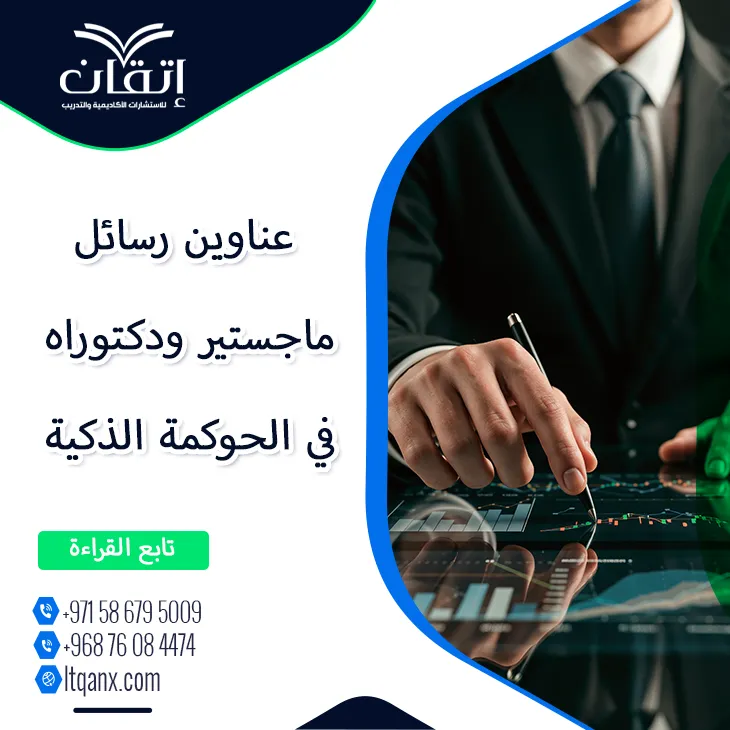وفي ختام الحديث، تبرز الحوكمة الذكية كمدخل حديث يعزز كفاءة الأداء المؤسسي ويربط بين التقنية وجودة القرار والاستدامة، وقد عكست عناوين رسائل ماجستير ودكتوراه في الحوكمة الذكية الاهتمام المتزايد بها بوصفها إطارًا تنظيميًا معاصرًا يواكب التحولات الرقمية، ومن هذا المنطلق، تأتي شركة إتقان باعتبارها شريك النجاح والتميز الأكاديمي في دعم الباحثين بخبرة منهجية ورؤية علمية واضحة، إذ تسهم في تحويل الأفكار البحثية إلى دراسات رصينة تلبي متطلبات الجودة والاعتماد الأكاديمي، وللحصول على دعم أكاديمي متكامل بكل سهولة، يمكن التواصل عبر تطبيق الواتساب والانطلاق بثقة نحو إنجاز بحث علمي متميز.