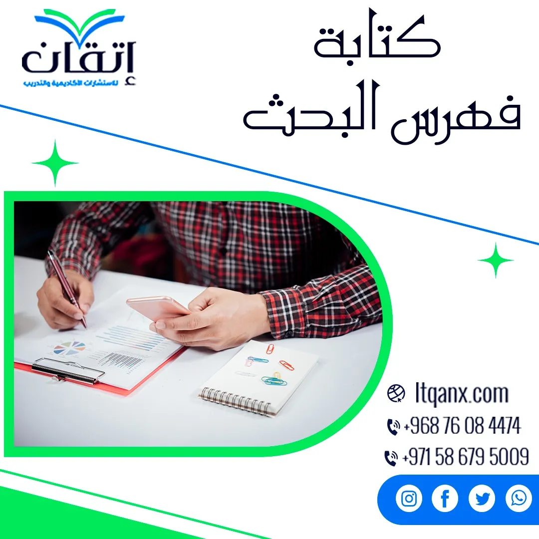 مع إتقان للاستشارات الأكاديمية والتدريب لن يكون إعداد كتابة فهرس البحث مجرد خطوة روتينية، بل تجربة منظمة تضمن وضوح البحث وسهولة تصفحه خبراؤنا المتخصصون في الإشراف الأكاديمي يقدمون لك الدعم الكامل لإعداد فهرس دقيق، ومتناسق، وشامل يعكس احترافية البحث ويُسهّل على القارئ الوصول لكل فكرة أو جدول أو شكل بصعوبة أقل اجعل بحثك متميزًا من بدايته حتى نهايته مع حلول إتقان الذكية التي تجمع بين الدقة والجودة والاحترافية الأكاديمية، كل ما عليك التواصل معنا عبر الواتساب