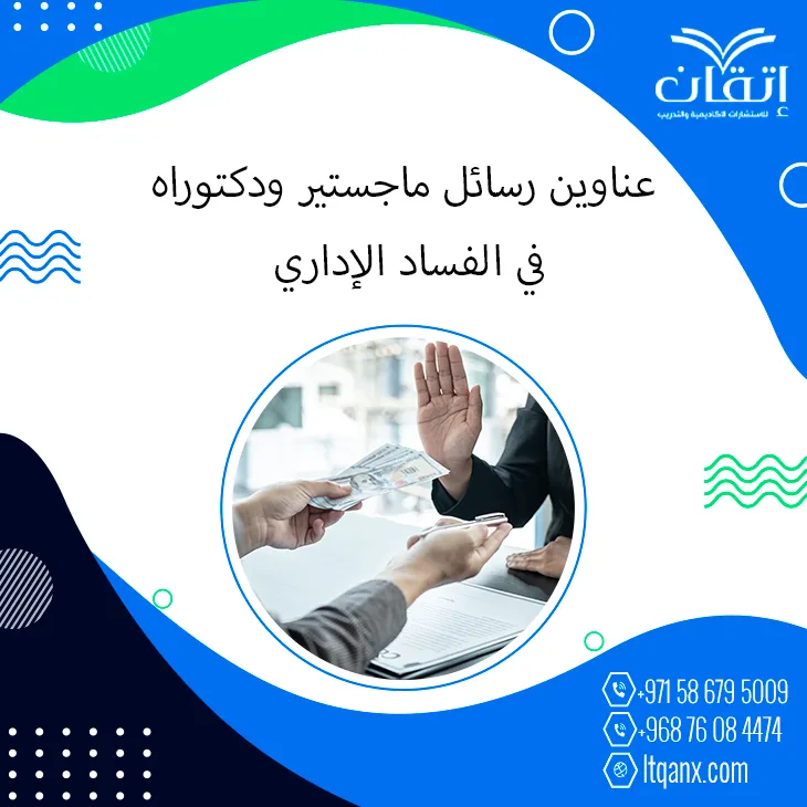 وفي الختام يتأكد أن البحث في الفساد الإداري يمثل خطوة أساسية لفهم مكامن الخلل وتحقيق النزاهة والكفاءة في المؤسسات، وتأتي عناوين رسائل ماجستير ودكتوراه في الفساد الإداري التي توفرها شركة إتقان لتكون مرجعًا موثوقًا للباحثين لتعزيز دراساتهم الأكاديمية، فشركة إتقان ليست مجرد جهة داعمة بل شريك النجاح والتميز الأكاديمي في مختلف مراحل البحث العلمي، وللحصول على الدعم الأكاديمي بسهولة واحترافية يمكن التواصل مع إتقان عبر تطبيق الواتساب والانطلاق بثقة نحو التفوق الأكاديمي.