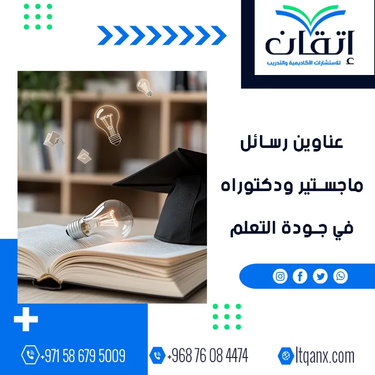 في عصر تتسارع فيه المعرفة وتتنوع أساليب التعلم أصبح جودة التعلم عاملًا محوريًا؛ لضمان تميز العملية التعليمية وفاعليتها، وإدراكًا لأهمية هذا المجال لدى الباحثين تقدم شركة إتقان للاستشارات الأكاديمية والتدريب بفريقها المتميز وذو الخبرة العالية باقة من عناوين رسائل ماجستير ودكتوراه في جودة التعلم تضم أحدث وأهم العناوين البحثية لدعم الباحثين وتمكينهم من تقديم دراسات رائدة، وهذه العناوين تمثل جسرًا عمليًا بين النظرية والتطبيق؛ لتسهيل البحث الأكاديمي بأسلوب مبتكر واحترافي.