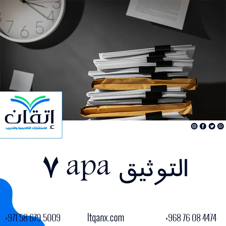اختر شركة إتقان للاستشارات الأكاديمية والتدريب لتكون شريكك الموثوق في رحلتك البحثية والأكاديمية، بفضل فريقنا المتخصص الذي يجمع بين الخبرة الأكاديمية والتقنية الحديثة، نضمن لك ترجمة دقيقة توثيق محترف بأسلوب التوثيق APA 7 ، وإشراف أكاديمي متكامل، معنا ستحصل على جودة عالية، تنظيم منهجي، ودعم مستمر يعزز نجاحك الأكاديمي ويقودك لتحقيق أهدافك بثقة واحترافية لا مثيل لها، كل ما عليك التواصل معنا عبر الواتساب.