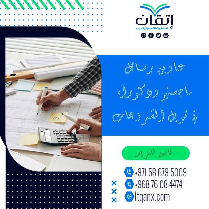 في عالم تتسارع فيه الفرص وتتزايد فيه التحديات يبرز تمويل المشروعات كجواز عبور نحو الابتكار والنمو الحقيقي، ولأن الباحثين يدركون عمق هذا المجال حرصت شركة إتقان للاستشارات الأكاديمية والتدريب على تقديم باقة من عناوين رسائل ماجستير ودكتوراه في تمويل المشروعات بروح إبداعية وكفاءة عالية، إن فريق إتقان المتميز يضع بين يديك أحدث الأفكار البحثية التي تمنحك ميزة تنافسية في مسارك العلمي، ومع كل عنوان تقدمه تؤكد إتقان أنها الداعم الأكثر معرفة باحتياجات الباحثين وطموحاتهم.