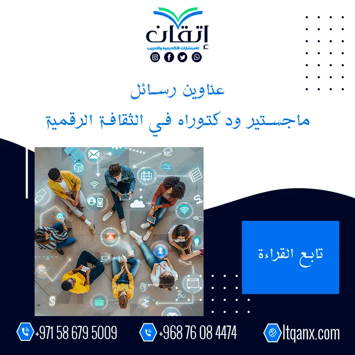 أصبحت الثقافة الرقمية اليوم أحد المرتكزات الأساسية لفهم التحولات المعرفية والتنظيمية في عالم يتسم بالتقنية المتسارعة، ويتنامى اهتمام الباحثين بالبحث في هذا المجال عبر الاطلاع على عناوين رسائل ماجستير ودكتوراه في الثقافة الرقمية باعتبارها مدخلًا علميًا لتحليل أثر الرقمنة في السلوك والفكر المؤسسي، وانطلاقًا من وعيها العميق بأهمية هذا التوجه البحثي تتميز شركة إتقان للاستشارات الأكاديمية والتدريب بجودة عالية وكفاءة إبداعية لامتلاكها فريق عمل محترف وذو خبرة، وقد مكنها ذلك من إعداد قائمة مختارة من أحدث وأهم العناوين البحثية دعمًا للباحثين في مسيرتهم الأكاديمية.
