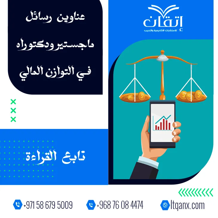 لم يعد التوازن المالي مجرد مفهوم محاسبي جامد بل غدا ركيزة أساسية لاستدامة الأفراد والمؤسسات، ومحورًا بحثيًا متجددًا يستقطب اهتمام الدارسين، وهو ما يتجلى بوضوح في تنوع عناوين رسائل ماجستير ودكتوراه في التوازن المالي التي تسعى لفهم أبعاده وتحدياته المعاصرة، وانطلاقًا من وعيها العلمي تتميز شركة إتقان للاستشارات الأكاديمية والتدريب بالجودة والكفاءة الإبداعية لاعتمادها على فريق عمل محترف وذو خبرة، فبادرت بتقديم باقة من أحدث وأهم العناوين البحثية في هذا المجال دعمًا للباحثين وتمكينًا لمسيرتهم الأكاديمية.