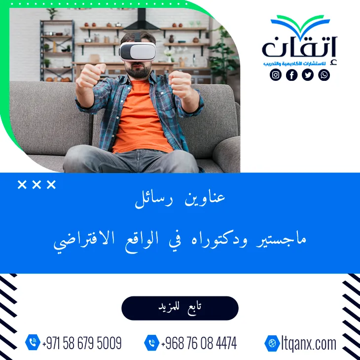 في هذا العالم الذي تتداخل فيه الخيالات مع الحقيقة ينهض الواقع الافتراضي كأحد أعظم التقنيات القادرة على إعادة تشكيل طرق التعلم، والتجربة، والإبداع، وإيمانًا بقوة هذا المجال وتأثيره المتصاعد في الأبحاث الحديثة تقدم شركة إتقان للاستشارات الأكاديمية والتدريب خبرتها المبدعة وجودتها العالية عبر فريق متخصص في دعم الباحثين، ولأن اختيار موضوع البحث هو الخطوة الأهم أعدت إتقان قائمة استثنائية من عناوين رسائل ماجستير ودكتوراه في الواقع الافتراضي تلائم التوجهات المستقبلية، وهذه العناوين تمنح الباحثين بوابة نحو دراسات أعمق وأكثر تطورًا، ومع إتقان يبدأ البحث برؤية مختلفة ومتكاملة.