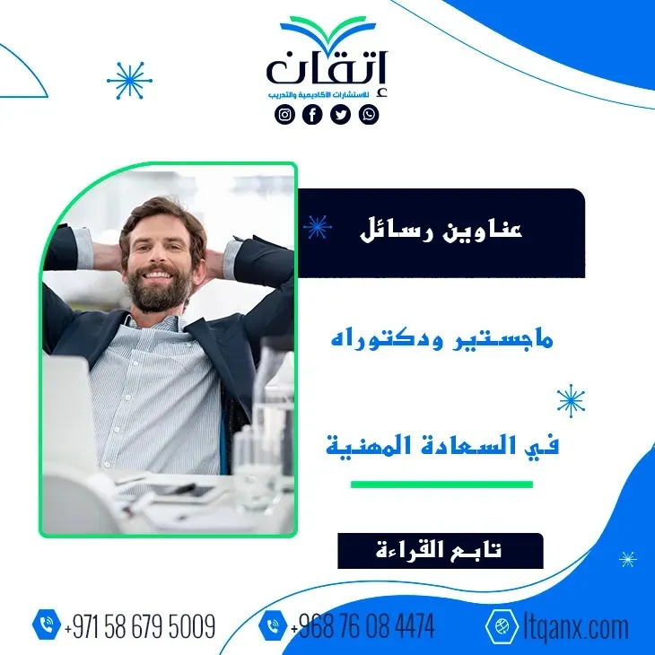 لم تعد السعادة المهنية مفهومًا ترفيهيًا في بيئات العمل الحديثة بل أصبحت مؤشرًا استراتيجيًا يعكس جودة الأداء والاستقرار النفسي والإنتاجية المستدامة، وإدراكًا لأهمية هذا المجال لدى الباحثين وطلبة الدراسات العليا تقدم شركة إتقان للاستشارات الأكاديمية والتدريب دعمًا نوعيًا قائمًا على الجودة والكفاءة الإبداعية وخبرة فريقها المتخصص، وانطلاقًا من هذا الدور توفر إتقان باقة بحثية متميزة تضم عناوين رسائل ماجستير ودكتوراه في السعادة المهنية لمواكبة أحدث الاتجاهات العلمية وتعزيز جودة البحث الأكاديمي.