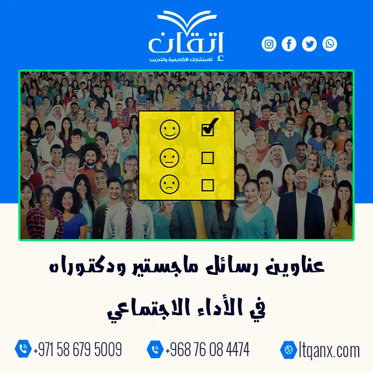 حين يُقاس نجاح الإنسان بقدرته على بناء علاقات متوازنة والتفاعل بوعي داخل مجتمعه يصبح الأداء الاجتماعي مؤشرًا حقيقيًا على نضجه النفسي وقدرته على التأثير الإيجابي، ومن هنا تنبع أهمية البحث العلمي في هذا المجال، وخاصةً عند صياغة عناوين رسائل ماجستير ودكتوراه في الأداء الاجتماعي بأسلوب يعكس عمق التحليل وحداثة الطرح، وانطلاقًا من إدراكها لأهمية هذا الموضوع تتميز شركة إتقان للاستشارات الأكاديمية والتدريب بالجودة والكفاءة الإبداعية، مستندةً إلى فريق عمل متميز وذو خبرة واسعة؛ لذلك حرصت على تقديم باقة من أحدث وأهم العناوين البحثية لدعم الباحثين وتمكينهم من التميز الأكاديمي.
