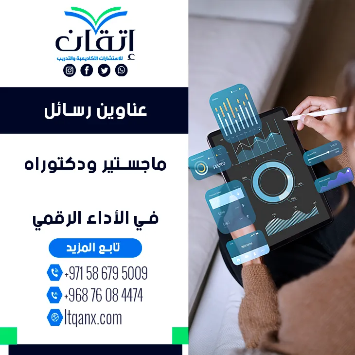 وفي الختام يظل الأداء الرقمي ركيزة أساسية في تحقيق التفوق الأكاديمي والمهني؛ مما يجعل اختيار عناوين رسائل ماجستير ودكتوراه في الأداء الرقمي خطوة حاسمة نحو التميز البحثي، وتؤكد شركة إتقان للاستشارات الأكاديمية والتدريب دورها كشريك النجاح والتميز الأكاديمي، من خلال تقديم دعم احترافي يلبي احتياجات الباحثين، ويمكنكم التواصل بسهولة عبر تطبيق الواتساب للحصول على استشارات أكاديمية متخصصة تفتح أمامكم آفاقًا جديدة من الإنجاز.