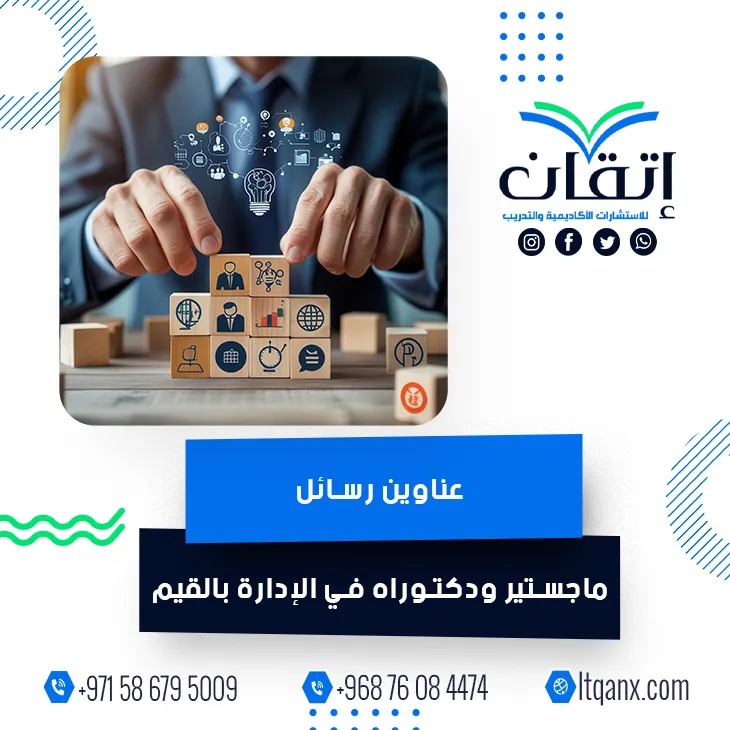 وفي ختام الحديث تمثل الإدارة بالقيم أحد المسارات البحثية الواعدة التي تساهم في بناء منظمات أكثر وعيًا واستدامة في بيئات العمل الحديثة، ومن هنا تبرز أهمية الاطلاع على عناوين رسائل ماجستير ودكتوراه في الإدارة بالقيم التي تساعد الباحثين على اختيار موضوعات علمية معاصرة ومؤثرة، وفي هذا الإطار تواصل شركة إتقان للاستشارات الأكاديمية والتدريب دورها بوصفها شريك النجاح والتميز الأكاديمي للباحثين، وكما يمكنكم التواصل بسهولة عبر تطبيق الواتساب للحصول على الدعم والاستشارات الأكاديمية المتخصصة.
