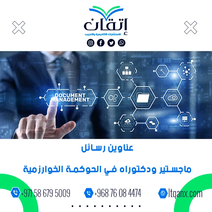 وفي الختام تظل شركة إتقان شريكًا موثوقًا للتميز الأكاديمي والدعم البحثي؛ حيث تجمع بين الخبرة والجودة الإبداعية، ويمكن للباحثين الوصول بسهولة إلى الدعم عبر تطبيق الواتساب للحصول على الإرشاد الأكاديمي الفوري، إن هذه المبادرة تتيح للباحثين الاستفادة من أهم عناوين رسائل ماجستير ودكتوراه في الحوكمة الخوارزمية وأكثرها رواجًا، ومع إتقان يصبح الطموح الأكاديمي واقعًا ملموسًا ونجاحًا مستدامًا.