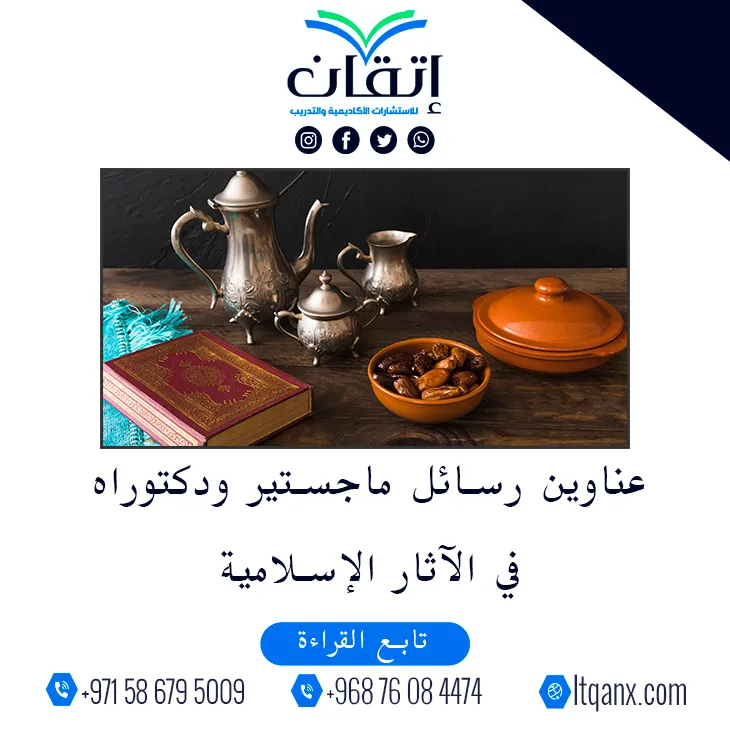 الآثار الإسلامية ليست مجرد مبان ونقوش بل هي شاهد حي على حضارة غنية وروح تراثية متجذرة في التاريخ، وإدراكًا لأهمية هذا المجال تقدم شركة إتقان للاستشارات الأكاديمية والتدريب بفريقها المبدع وذو الخبرة قائمة من أحدث عناوين رسائل ماجستير ودكتوراه في الآثار الإسلامية؛ لدعم الباحثين وتمكينهم من الإبداع والتميز العلمي.