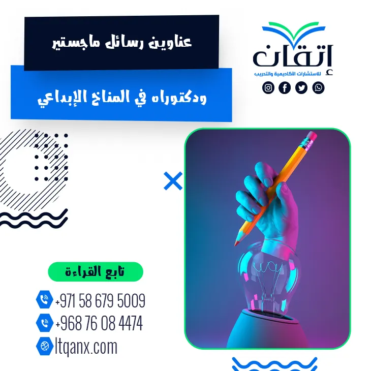 لا يولد الإبداع مصادفة بل ينمو في بيئة تحفز الفكر وتحتضن الأفكار الجديدة، وهو ما يُجسده مفهوم المناخ الإبداعي بوصفه المحرك الخفي لتميز المؤسسات وتطورها، ومع تزايد الاهتمام البحثي بهذا المجال يسعى الباحثون إلى استكشاف عناوين رسائل ماجستير ودكتوراه في المناخ الإبداعي لفهم أبعاده وتطبيقاته المعاصرة، وانطلاقًا من إدراكها لأهمية هذا الموضوع تقدم شركة إتقان للاستشارات الأكاديمية والتدريب قائمة حديثة من العناوين البحثية المتميزة، مستندةً إلى جودة العمل وكفاءة إبداعية بفضل فريق متخصص يمتلك خبرة واسعة في دعم الباحثين.