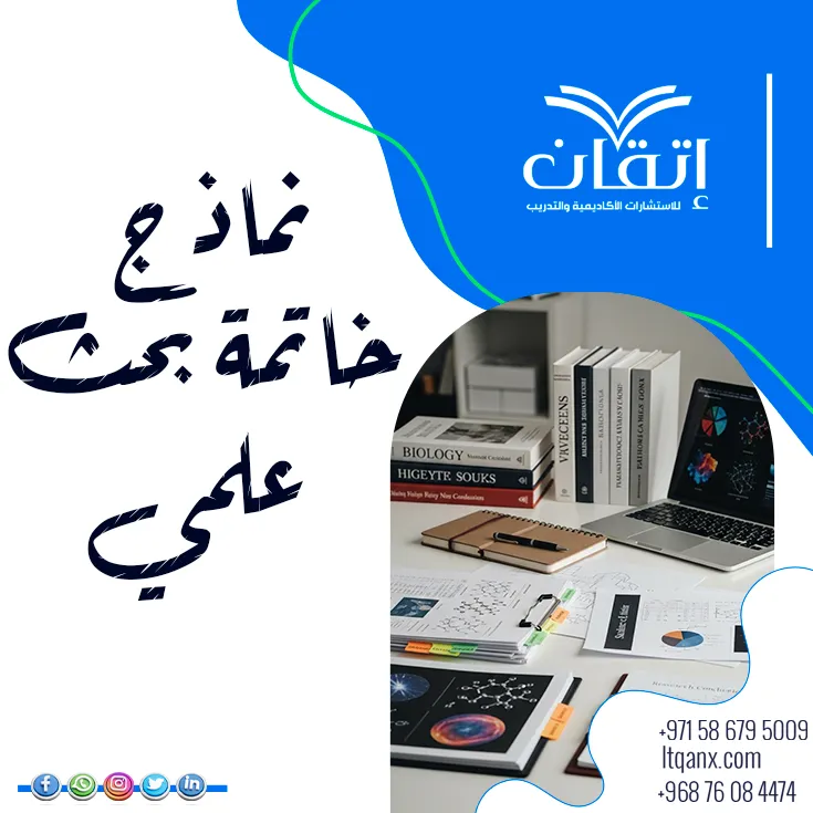 تقدم شركة إتقان للاستشارات الأكاديمية والتدريب دعم أكاديمي متكامل للباحثين والطلاب، بدء من صياغة نماذج خاتمة بحث علمي احترافية، إلى مراجعة اللغة والأسلوب الأكاديمي لضمان إخراج الأبحاث بأعلى مستوى من الجودة، كما نوفر خدمات البحث العلمي والدورات التدريبية في الدول العربية، نقدم لك المساعدة في كتابة البحوث والترجمة، مثل: المملكة العربية السعودية، والإمارات، وعمان، والكويت، يمكنكم التواصل معنا بسهولة عبر الواتساب للحصول على استشارات مباشرة وحلول أكاديمية شاملة تعزز نجاح أبحاثكم ومشاريعكم التعليمية.