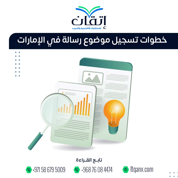 إذا كنت تسعى لبدء مسارك الأكاديمي بثقة أو إعداد بحث علمي احترافي يحقق لك التميز والقبول، فإن شركة إتقان للاستشارات الأكاديمية والتدريب هي خيارك الأمثل، وقد تعرفنا من خلال هذا المحتوى على أهمية خطوات تسجيل موضوع رسالة في الإمارات ودورها في ضمان اختيار موضوع بحثي قوي ومقبول أكاديميًا، كما تقدم إتقان  المساعدة في إعداد رسائل الماجستير والدكتوراة والابحاث في مختلف الدول العربية، مثل: الإمارات والمملكة العربية السعودية وقطر، ويمكنكم التواصل معنا بسهولة عبر الواتساب للحصول على الدعم الأكاديمي المتكامل.