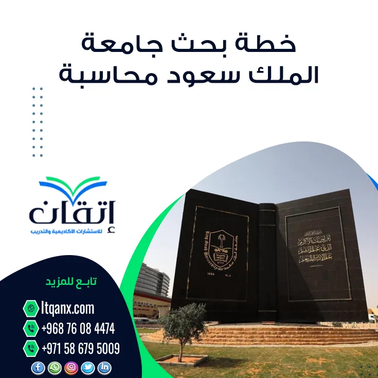 في الختام تُعد خطة بحث جامعة الملك سعود محاسبة خطوة أساسية لفهم أهمية التخطيط العلمي السليم في إعداد الأبحاث الأكاديمية بشكل منهجي ودقيق، وتبرز إتقان للاستشارات الأكاديمية والتدريب كخيار متميز في تقديم خدمات البحث العلمي والدورات التدريبية في المملكة العربية السعودية ودول عربية أخرى، مثل: الكويت وقطر وغيرها، بما يدعم الطلاب في مسيرتهم الأكاديمية، ويمكن التواصل مع إتقان عبر الواتساب للحصول على دعم احترافي يساعد في تحقيق التميز والنجاح في إعداد الأبحاث والدراسات.