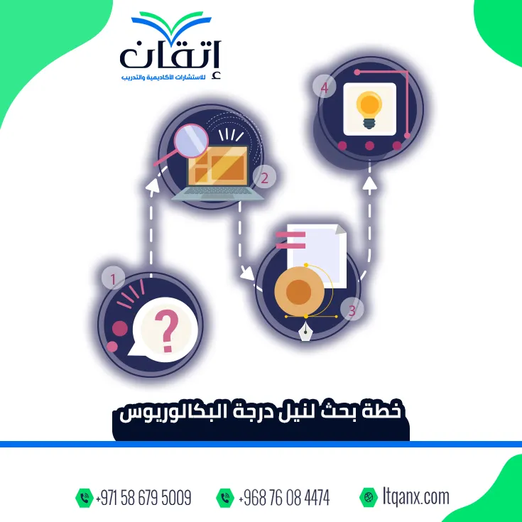 في النهاية، يعد إعداد خطة بحث بكالوريوس خطوة أساسية نحو النجاح الأكاديمي، ومن الضروري أن تكون الخطة دقيقة ومبنية على أسس علمية قوية؛ إذا كنت بحاجة إلى مساعدة احترافية في صياغة خطة البحث أو الحصول على دعم أكاديمي متميز، فإن إتقان للاستشارات الأكاديمية تقدم لك خدمات البحث العلمي عالية الجودة في السعودية، الإمارات، الكويت، قطر، عمان وجميع الدول العربية، نقدم لك مركز لاعداد رسائل الماجستير والدكتوراة والابحاث العلمية، لا تتردد في التواصل معنا عبر واتساب الآن.