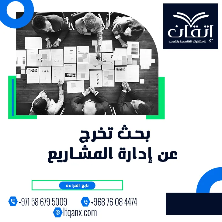 وفي الختام، تمثل إدارة المشاريع ركيزة أساسية لتحقيق النجاح في أي مجال، حيث تساعد في تنظيم العمل وضمان تنفيذ الأهداف بفعالية، وكما يتضح من بحث تخرج عن إدارة المشاريع فإن الابتكار والتكنولوجيا يلعبان دورًا حيويًا في تحسين جودة وكفاءة العمليات، وفي هذا السياق، تبرز شركة إتقان كخيار مثالي لدعم مشاريعكم الأكاديمية والتطويرية من خلال خدمات التدريبيةوالبحث العلمي المتخصصة، مع خبرتها العميقة، تقدم شركة إتقان حلولًا مبتكرة تضمن نجاح كل مشروع علمي وعملي، من خلال شراكتكم مع إتقان، تضمنون تنفيذ مشاريعكم بكفاءة ودقة عالية، نقدم لك خدمات البحث العلمي، كل ما عليك التواصل معنا عبر الواتساب.