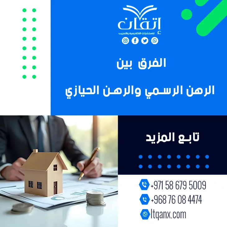 قدمت لكم شركة إتقان بعض المعلومات عن الفرق بين الرهن الرسمي والرهن الحيازي، ويمكننا مساعدتك في إعداد بحثك العلمي بشكل احترافي عن طريق نخبة من الأساتذة والخبراء، نقدم لك خدمات المساعدة في كتابة الرسائل العلمية، كل ما عليك فعله هو التواصل معنا عبر الواتساب وسيتم الرد عليكم في أسرع وقت.