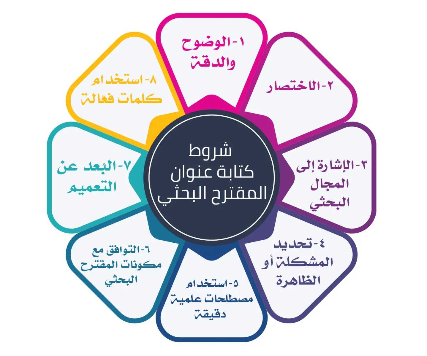 يجب أن يكون العنوان واضحًا ومباشرًا بحيث يُظهر بشكل واضح مكونات المقترح البحثي والموضوع الذي سيتم معالجته، ويشترط أن يتجنب العنوان الغموض أو التعقيد.
