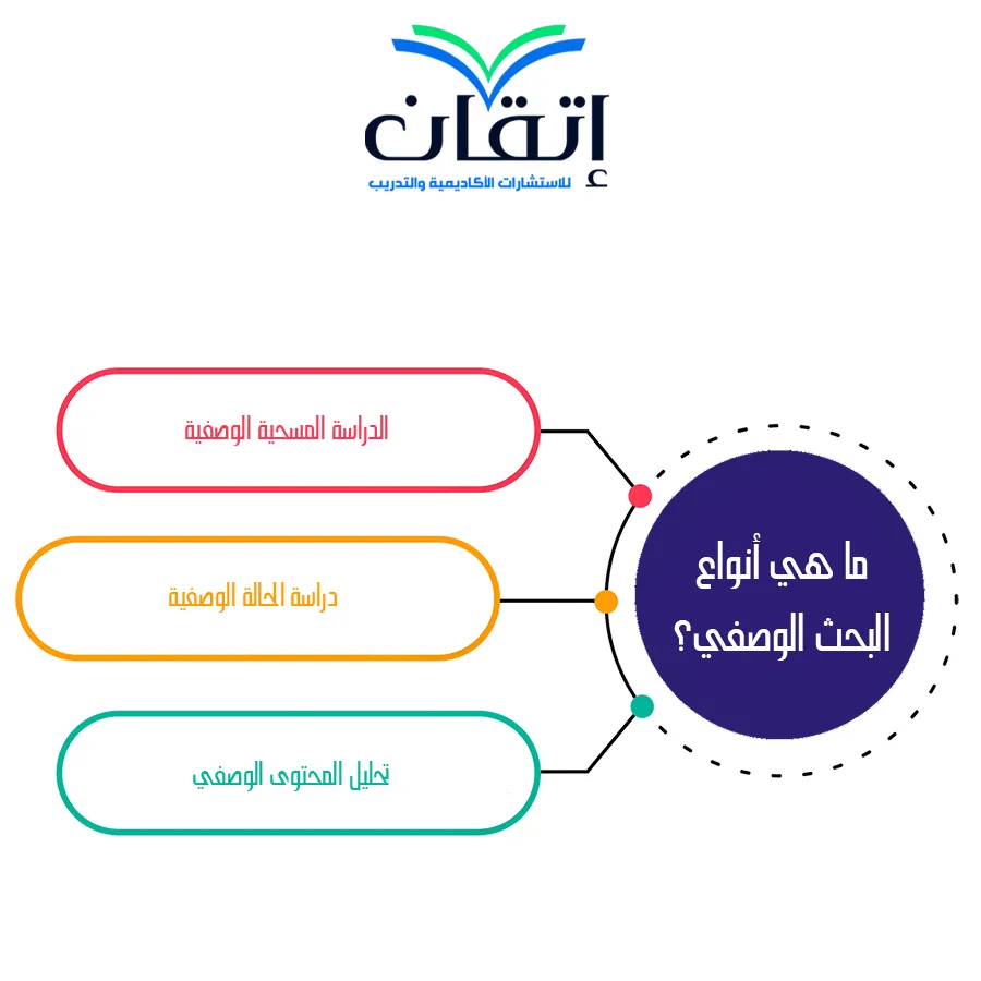 ✦ يتضمن البحث الوصفي عدة أنواع تختلف باختلاف أهداف الدراسة وأساليب جمع البيانات المستخدمة، إلا أنّها تشترك جميعًا في التركيز على وصف الظواهر كما هي دون تدخل الباحث في تغييرها؛ لذلك عند صياغة عنوان بحث، يجب أن يُراعى نوع الوصف الذي ستتناوله الدراسة؛ لتحديد النوع الأنسب من هذه الأنواع.