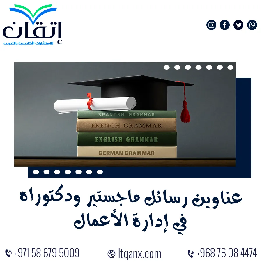 وفي الختام يعد اختيار عنوان مناسب لرسالة الماجستير أو الدكتوراه خطوة أساسية في مسيرتك الأكاديمية، وهنا تبرز أهمية عناوين رسائل ماجستير ودكتوراه في إدارة الأعمال كمرجع غني بالأفكار المبتكرة التي تساعدك على بناء دراسة علمية متميزة، وإذا كنت تبحث عن دعم متخصص في هذا المجال، فإن شركة إتقان تقدم لك الخبرة والإشراف الأكاديمي اللازم لاقتراح عناوين مبتكرة ومناسبة لرسالتك؛ مما يضمن لك التميز والنجاح في مسيرتك الدراسية، وللتواصل معنا والحصول على استشارات مباشرة يمكنك الاعتماد على الواتساب، ونحن في انتظار تواصلك لتقديم الدعم الكامل لمشروعك البحثي.