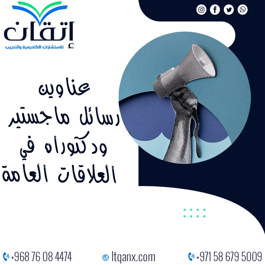 وختامًا تبقى العلاقات العامة المجال الأوسع لفهم ديناميكيات الاتصال وبناء الثقة المؤسسية، وهو ما يجعلها ركيزة أساسية للباحثين والمهنيين على حد سواء، والاطلاع على عناوين رسائل ماجستير ودكتوراه في العلاقات العامة يمنح الدارسين فرصًا لاختيار موضوعات ثرية تساهم في تطوير المعرفة الأكاديمية والممارسة العملية معًا، وإذا كنت تطمح للحصول على دعم متخصص في هذا المجال، فإن شركة إتقان للاستشارات الأكاديمية والتدريب تضع خبرتها بين يديك، لتقترح لك عناوين مبتكرة وتقدم لك المساندة الكاملة في كتابة بحوثك الجامعية، بما يضمن لك التميز والنجاح مع إمكانية التواصل المباشر عبر الواتساب للانطلاق نحو مستقبل أكاديمي أكثر إشراقًا.