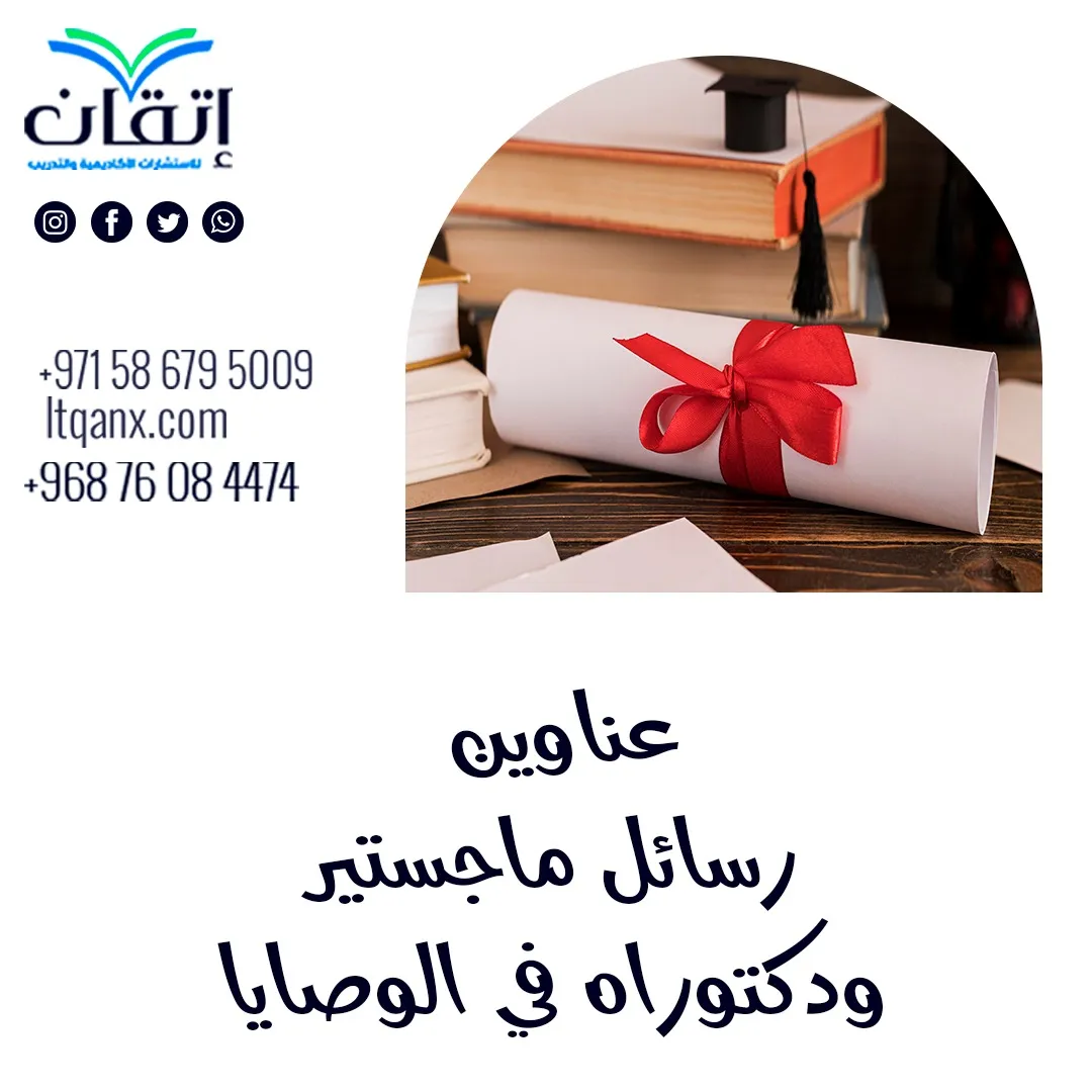 وفي النهاية بعد عرض أبرز عناوين رسائل الماجستير والدكتوراه في الوصايا، نسأل الله العلى العظيم بالتوفيق لجميع الباحثين، وإذا أردت في أي وقت معرفة عناوين لرسالتك العلمية، كل ما عليك هو الاعتماد على شركة "إتقان" للاستشارات الأكاديمية والتدريب، يوجد لدينا نخبة من المتخصصين في هذا المجال، يمكنك التواصل معنا عبر الواتساب.