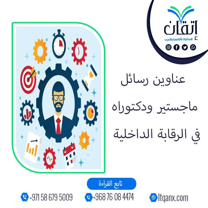 في عالم الأعمال والتمويل المتغير تبرز الرقابة الداخلية كأداة أساسية لحماية الأصول، وضمان دقة البيانات المالية والالتزام بالسياسات، وحرصًا على دعم الباحثين في هذا المجال الحيوي، وتقدم شركة إتقان للاستشارات الأكاديمية والتدريب بفضل فريقها المتميز وكفاءتها الإبداعية باقة حصرية من أحدث وأهم عناوين رسائل ماجستير ودكتوراه في الرقابة الداخلية؛ لتعزيز التميز الأكاديمي والإبداع البحثي.