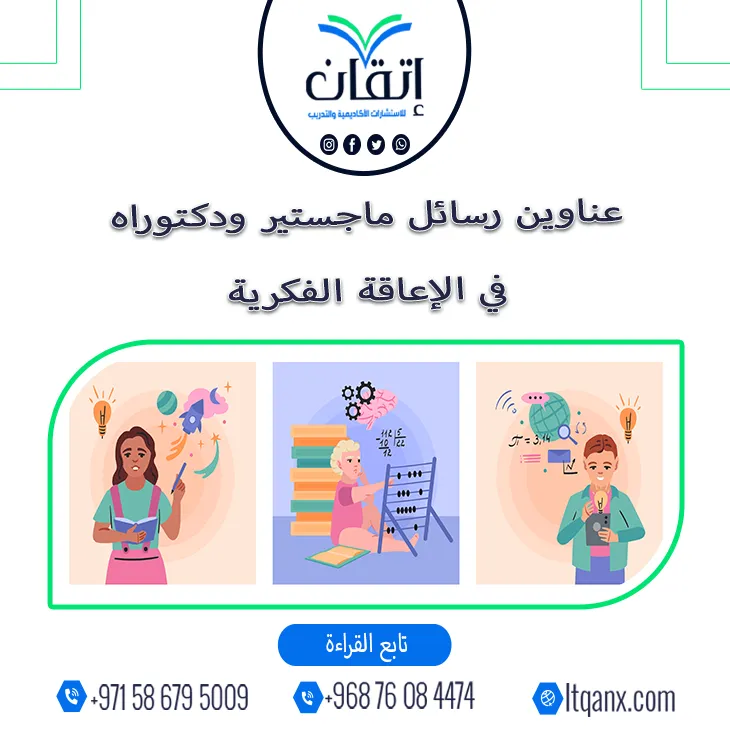 وفي ختام الحديث تؤكد شركة إتقان للاستشارات الأكاديمية والتدريب أنها ليست مجرد جهة استشارية بل شريك النجاح والتميز الأكاديمي لكل باحث يسعى إلى الريادة في مجاله، فإذا كنت تبحث عن عناوين رسائل ماجستير ودكتوراه في الإعاقة الفكرية تجمع بين الحداثة والعمق العلمي، فإن فريق إتقان جاهز لتقديم الدعم الكامل لك بخبرة واحترافية؛ لذلك لا تتردد في التواصل عبر تطبيق الواتساب بكل سهولة للحصول على الاستشارة الأكاديمية المخصصة.