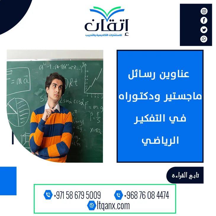 من بين خيوط الفكر التي تشكل وعي الإنسان يسطع التفكير الرياضي كأداة عميقة تفتح آفاق المنطق والتحليل، وتمنح العقل قدرة على قراءة العالم بلغة الأرقام والبراهين، ومع تنامي الاهتمام العلمي بهذا المجال أصبح البحث عن عناوين رسائل ماجستير ودكتوراه في التفكير الرياضي خطوة جوهرية لمن يرغب في التعمق في جذور الثقافة العقلية وصناعة الحلول الذكية، وهنا تتقدم شركة إتقان للاستشارات الأكاديمية والتدريب بثقة تليق بخبرتها وتميزها، موفرةً للباحث بيئة معرفية قوية وفريقًا يمتلك الخبرة والإبداع في دعم المشاريع البحثية، وتدرك الشركة أهمية التفكير الرياضي في تطوير البحث التربوي والتطبيقي، ولذلك أعدّت مجموعة من أحدث وأبرز العناوين التي تمنح الباحث بداية قوية ومنهجًا واضحًا.